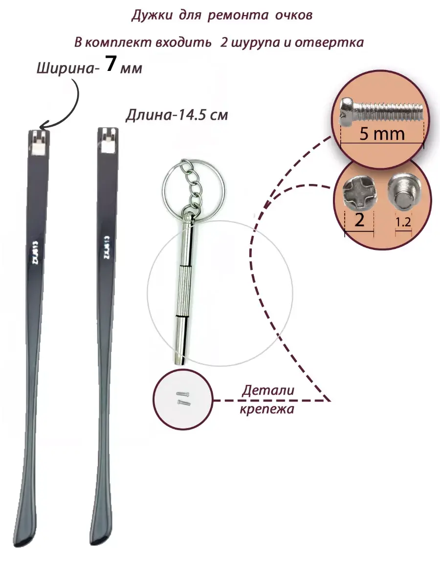 В комплекте вы найдете все необходимое для ремонта очков. Во-первых, дужки изготовлены из прочного и надежного материала, что обеспечивает долгий срок службы. Они легко крепятся к оправе и стеклам, обеспечивая надежную фиксацию.дужки для очков с флексами.
